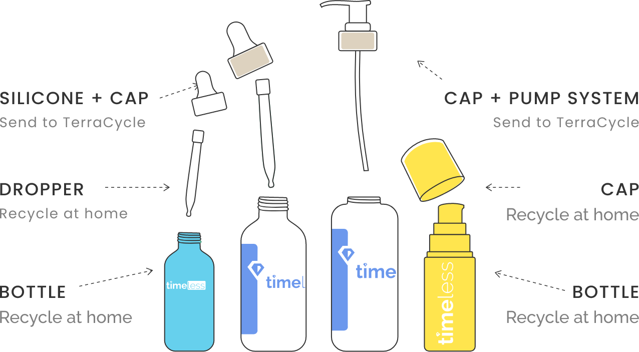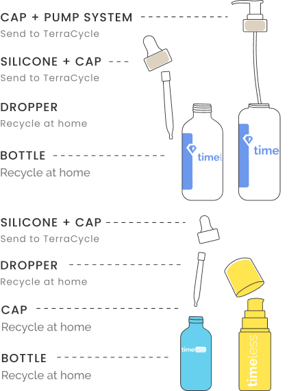 Separate silicone, cap and pump system to send to TerraCycle. Recycle the glass bottle and dropper at home