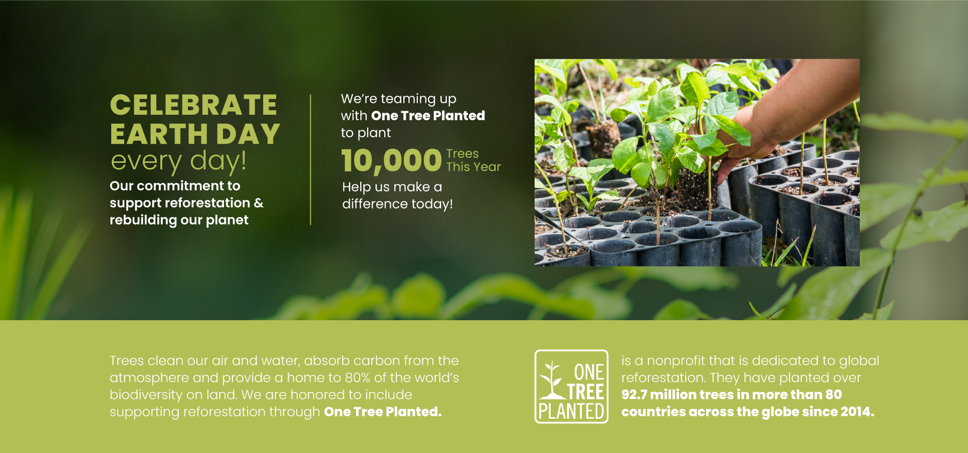 Our commitment to reforestation and rebuilding the planet. We teamed up with One Tree Planted to plant 10,000 trees.