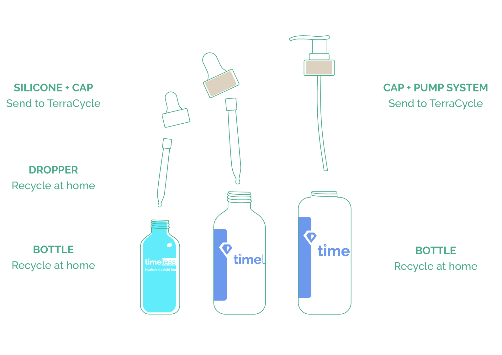 Separate silicone, cap and pump system to send to TerraCycle. Recycle the glass bottle and dropper at home